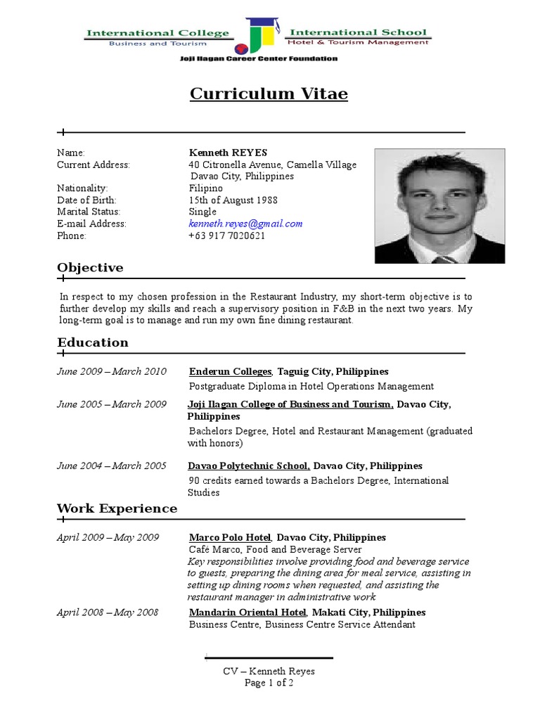 further develop my skills and reach a supervisory position in F&B in the next two years. My