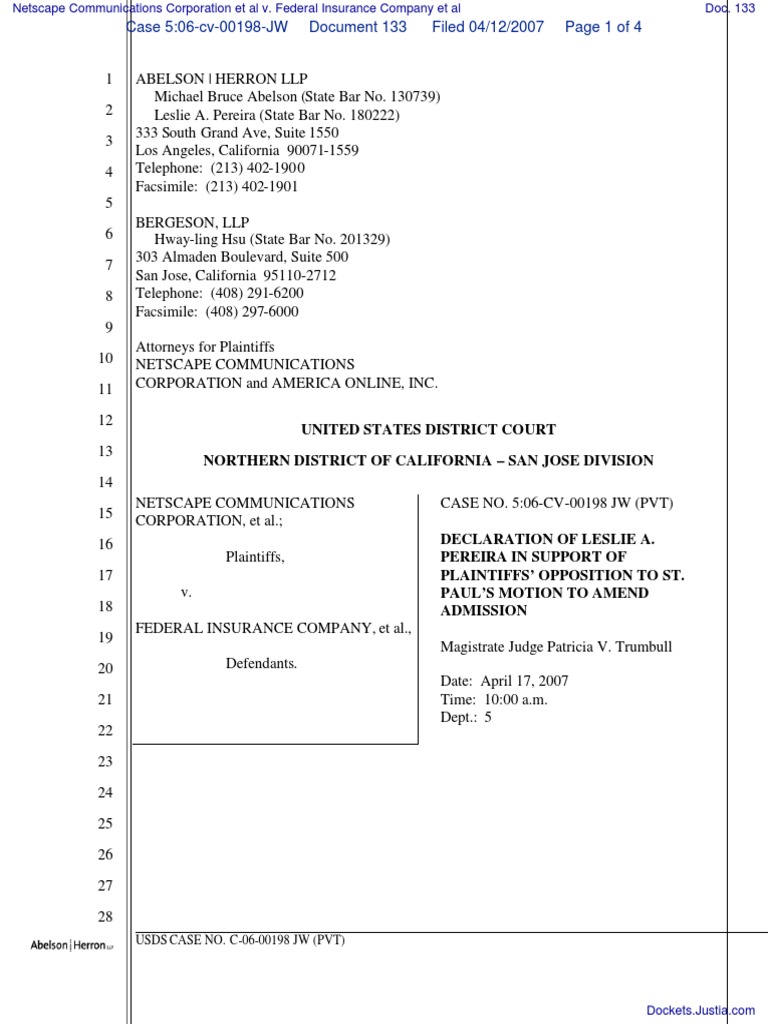 Netscape Communications Corporation Et Al v. Federal Insurance Company Et Al - Document No. 133