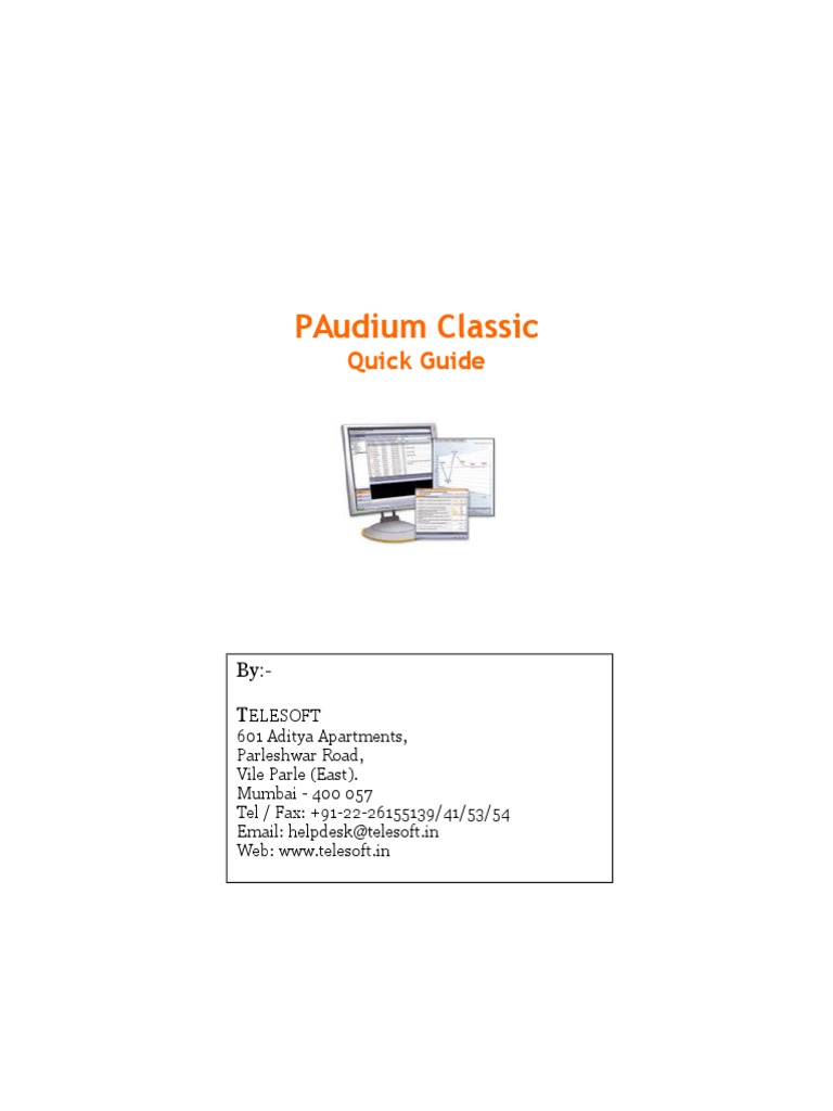 The document provides a quick guide for using the PAudium Classic telephone call recording software. It describes the key features and functions of the software including the dashboard, live status monitoring, query and report generation. The dashboard allows users to play, copy, and comment on recorded calls. Live status shows the real-time status of monitored phone lines. Query and report functions allow searching and reporting on recorded call data. The guide also covers global settings for minimizing the software and customizing the background color.