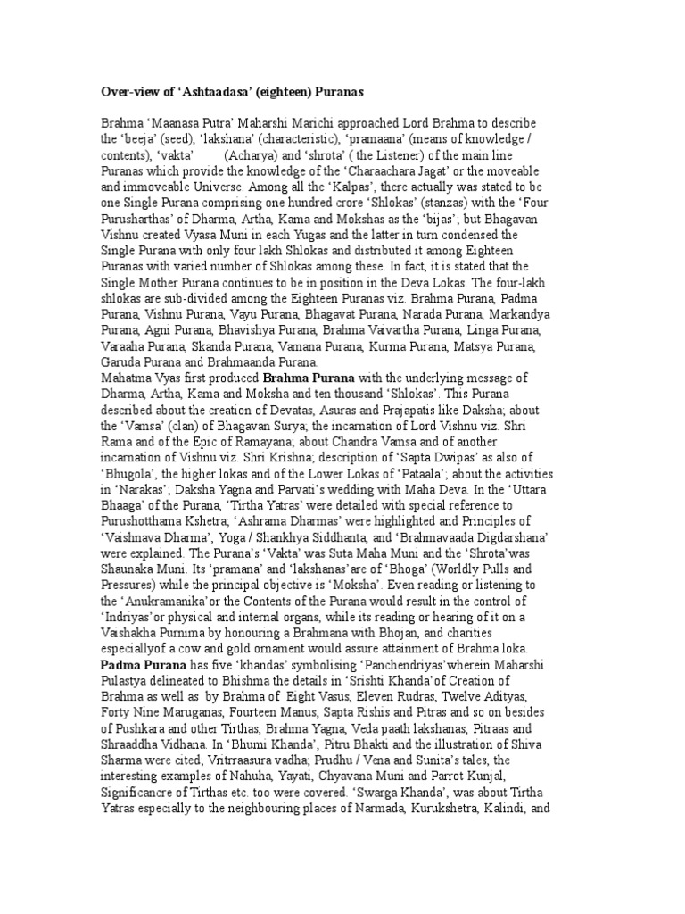 shlokas are sub-divided among the Eighteen Puranas viz. Brahma Purana, Padma