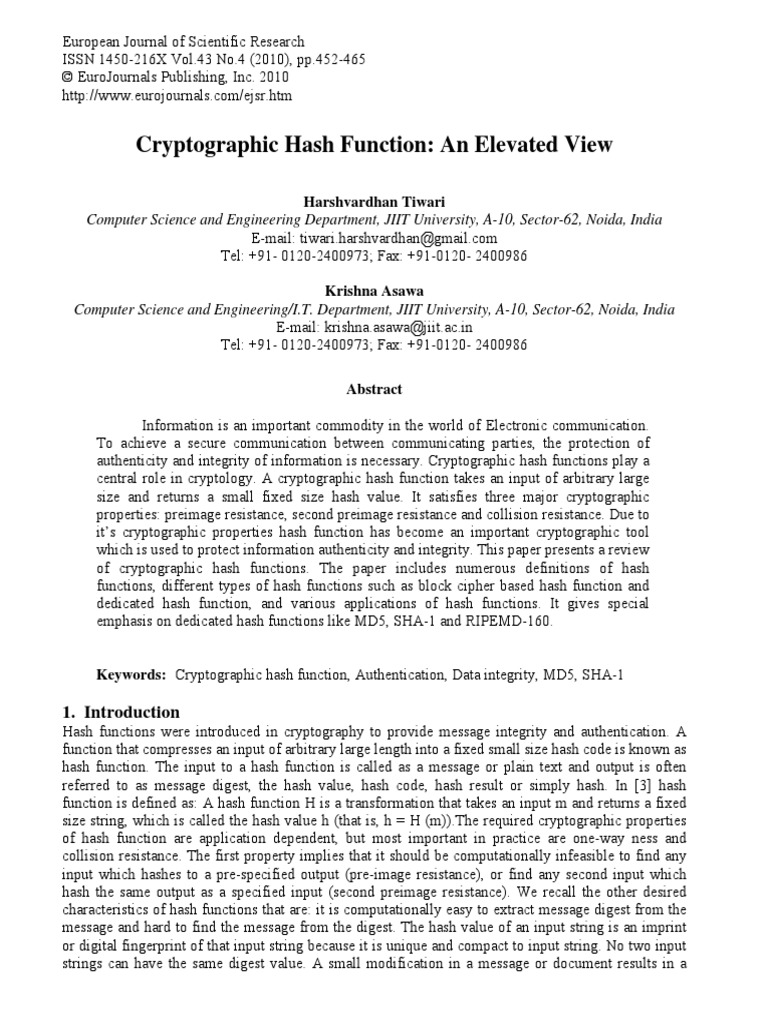 of cryptographic hash functions. The paper includes numerous definitions of hash