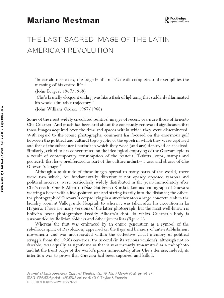 This document summarizes two iconic photographs of Ernesto "Che" Guevara that came to represent different aspects of his legacy after his death. The first photograph, taken by Alberto Korda in 1960, depicted a young Che wearing a beret and became a symbol of revolution embraced by protest movements. The second photograph, taken by Freddy Alborta in 1967, showed Che's corpse surrounded by Bolivian soldiers after his execution, serving to confirm his death for the world's media. The document discusses documentaries about the photographers and how these two images came to take on greater symbolic meaning beyond just documenting Che, with Alborta seeing Christ-like qualities in Che's body and the staging of his corpse evoking