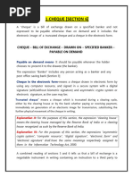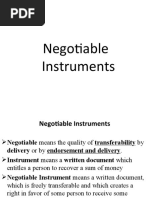 Negotiable instruments are written documents that entitle a person to a sum of money and can be transferred by delivery or endorsement. Key types include promissory notes, bills of exchange, and cheques, each with specific characteristics and legal requirements. The document outlines the essential elements, parties involved, and distinctions between these instruments, as well as the process of negotiation and endorsement.