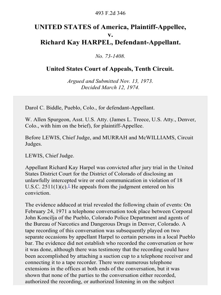 This document is a court opinion regarding the appeal of Richard Kay Harpel's conviction for disclosing an unlawfully intercepted wire communication. The court summarizes the evidence presented at trial, including that a recorded phone conversation between a police officer and drug agents was played by Harpel in a bar. The court then discusses Harpel's arguments that there was no interception under the statute and no expectation of privacy. The court analyzes the legal definition of interception and whether an extension phone could qualify as an intercepting device. The court ultimately upholds Harpel's conviction, finding that the government met its burden of proving beyond a reasonable doubt that an interception occurred through a device other than a phone used in the ordinary course of