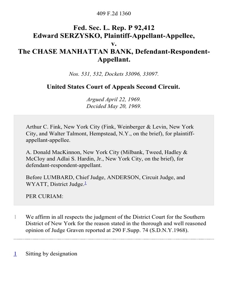 The United States Court of Appeals for the Second Circuit affirmed the judgment of the District Court for the Southern District of New York in all respects regarding a case between Edward Serzysko and The Chase Manhattan Bank. The appeals court adopted the reasoning of the district court's thorough and well-reasoned opinion published at 290 F. Supp. 74 (S.D.N.Y. 1968) that fully addressed the issues in the case.