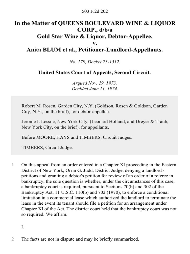 In The Matter of Queens Boulevard Wine & Liquor Corp., D/B/A Gold Star Wine & Liquor, Debtor-Appellee v. Anita Blum, Petitioner-Landlord-Appellants, 503 F.2d 202, 2d Cir. (1974)