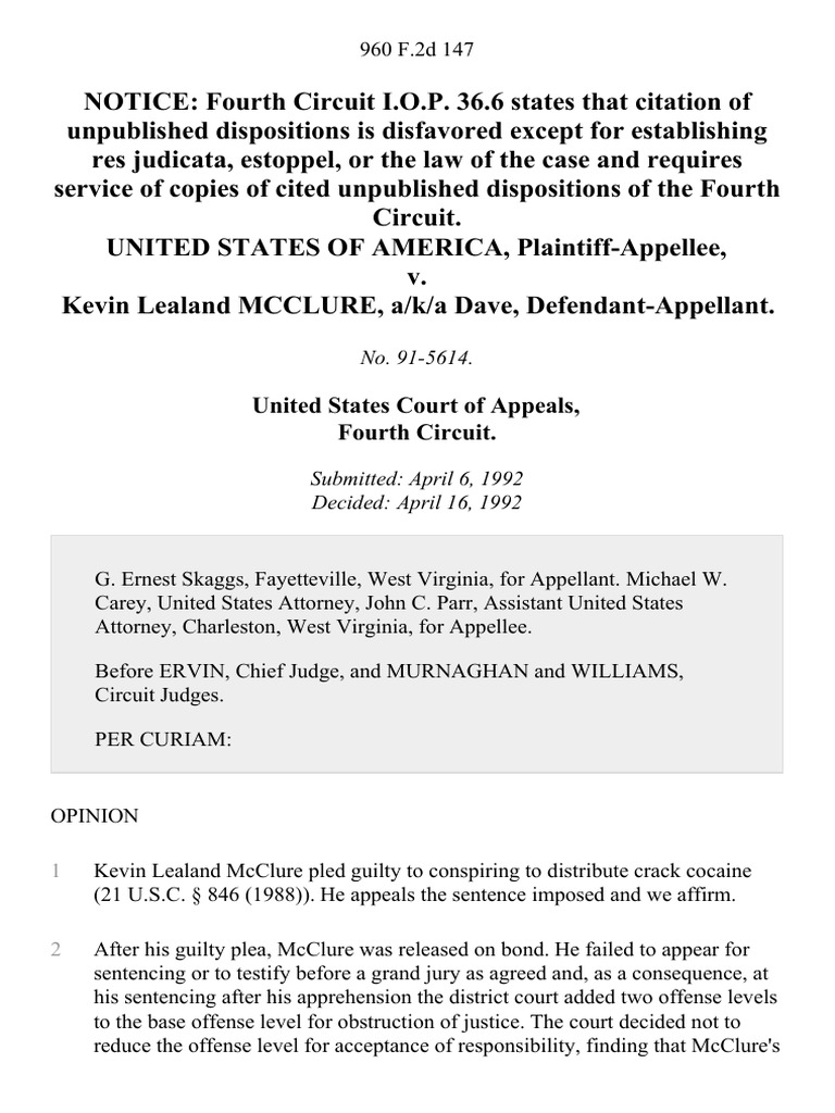 Kevin Lealand McClure pled guilty to conspiring to distribute crack cocaine