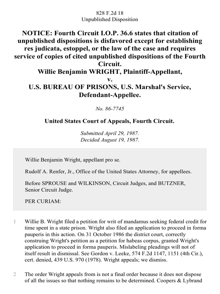 Willie Benjamin Wright v. U.S. Bureau of Prisons, U.S. Marshal's Service, 828 F.2d 18, 4th Cir. (1987)