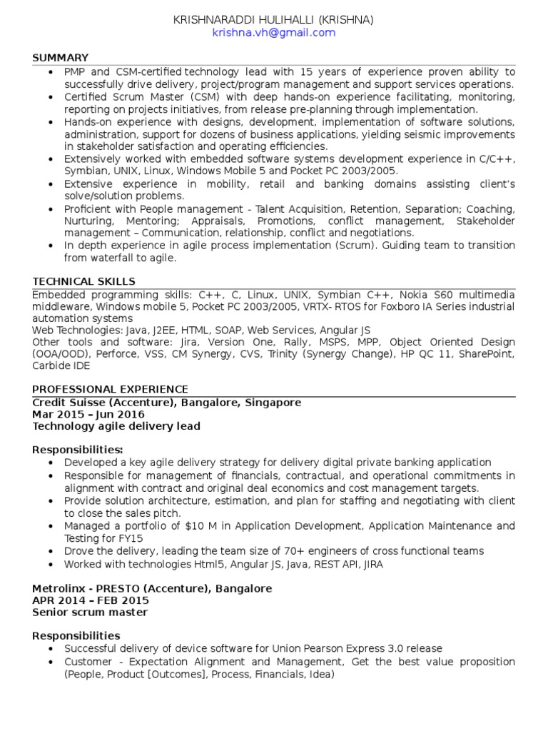 This document summarizes the experience and qualifications of Krishnaraddi Hulihalli (Krishna) as a technology lead with 15 years of experience in project/program management, software development, and support services. It outlines Krishna's experience facilitating agile projects across various domains including mobility, retail, and banking. Technical skills and tools are also listed, along with professional experience highlights from various roles as a Scrum Master, Senior Scrum Master, and Technology Agile Delivery Lead at companies such as Credit Suisse, Metrolinx, CVS Caremark, Kohl's, and Lowes.