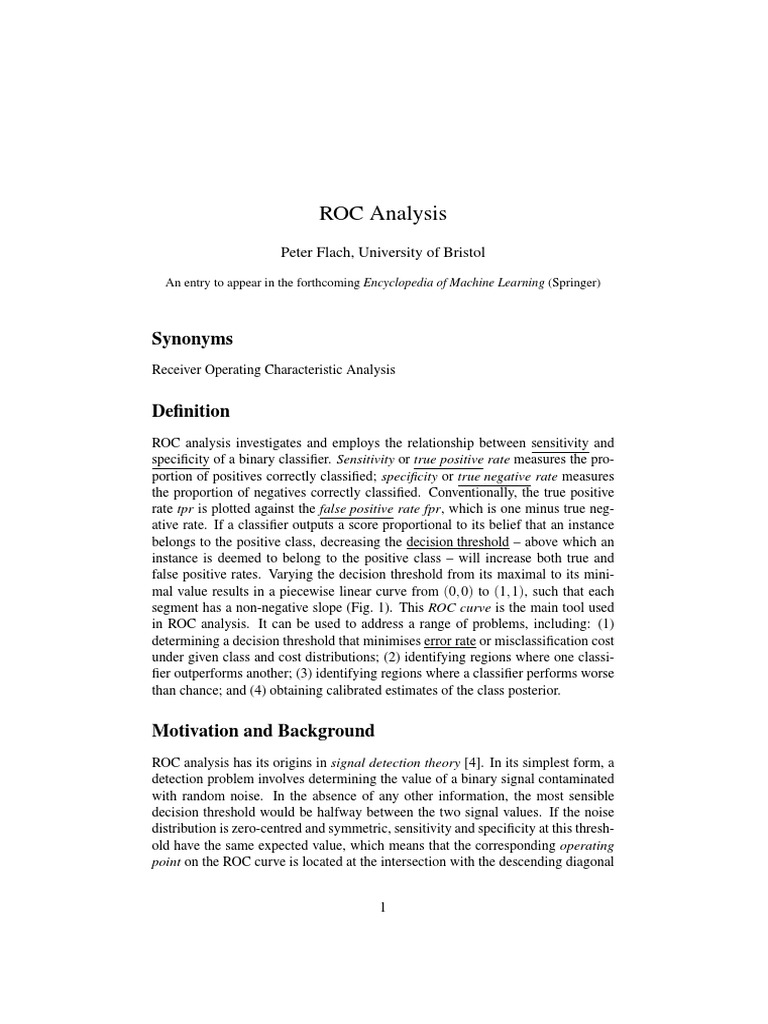 ROC analysis has its origins in signal detection theory [4]. In its simplest form, a