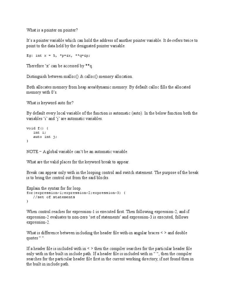 The document discusses various concepts in C programming language such as pointers, memory allocation functions malloc() and calloc(), storage classes like auto and register, looping statements like for loop, header file inclusion, negative number representation, static variables, NULL pointers, extern specifier, string and array functions like sprintf(), base address of an array, dangling pointers, lvalue and rvalue, actual and formal parameters, void pointers, nested and self-referential structures, preprocessors, command line arguments, function pointers, file opening modes, operators like address of(&) and comma(,), static functions, math library compilation, macro continuation character(\), variable arguments, null statements, and more.