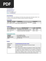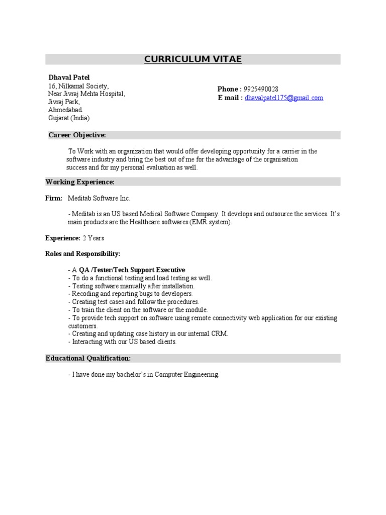 Dhaval Patel's curriculum vitae summarizes his career objective, work experience, educational qualifications, computer skills, projects, strengths, and personal information. He has 2 years of experience as a QA tester and tech support executive for Meditab Software Inc. He completed a bachelor's degree in computer engineering and has skills in languages like C, C++, C#, and Java. His projects include developing a textile marketing website using ASP.net and a matrimonial website for his academic coursework.