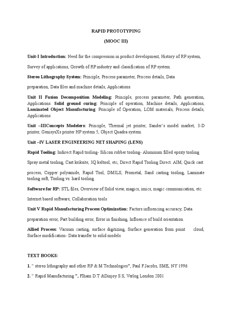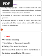 This document provides an overview of a course on rapid prototyping (MOOC III). It covers various rapid prototyping systems and processes including stereo lithography, fusion decomposition modeling, solid ground curing, laminated object manufacturing, and concepts modelers. It also discusses rapid tooling techniques like indirect and direct methods. Finally, it covers topics like data preparation, part building errors, build orientation influence, allied processes, and software used for rapid prototyping.