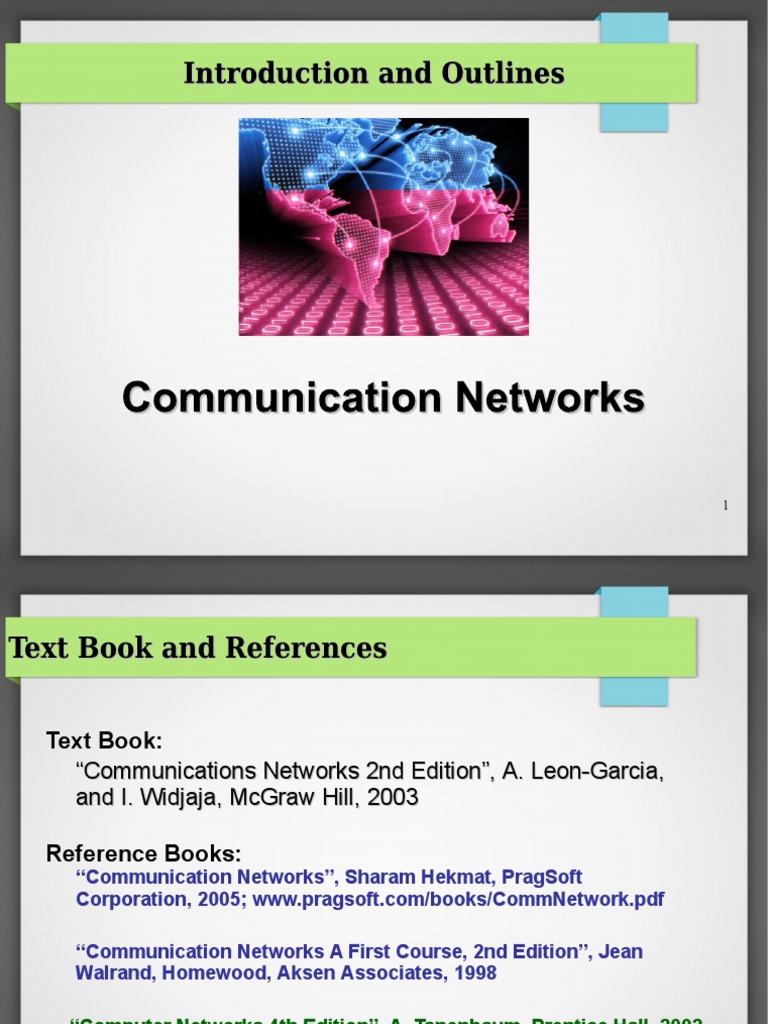 The document provides information about textbooks, reference books, and what students need to study for the communication networks course. It discusses the importance of understanding concepts rather than just memorization. It also emphasizes practicing problems and getting help from teaching assistants. The document then provides a brief history of communication networks and discusses some key aspects of simple telephone networks including voice transmission, signaling, and switching to connect calls. It introduces basic network components, types of networks based on geography and access, and internetworking using gateways between different networks.