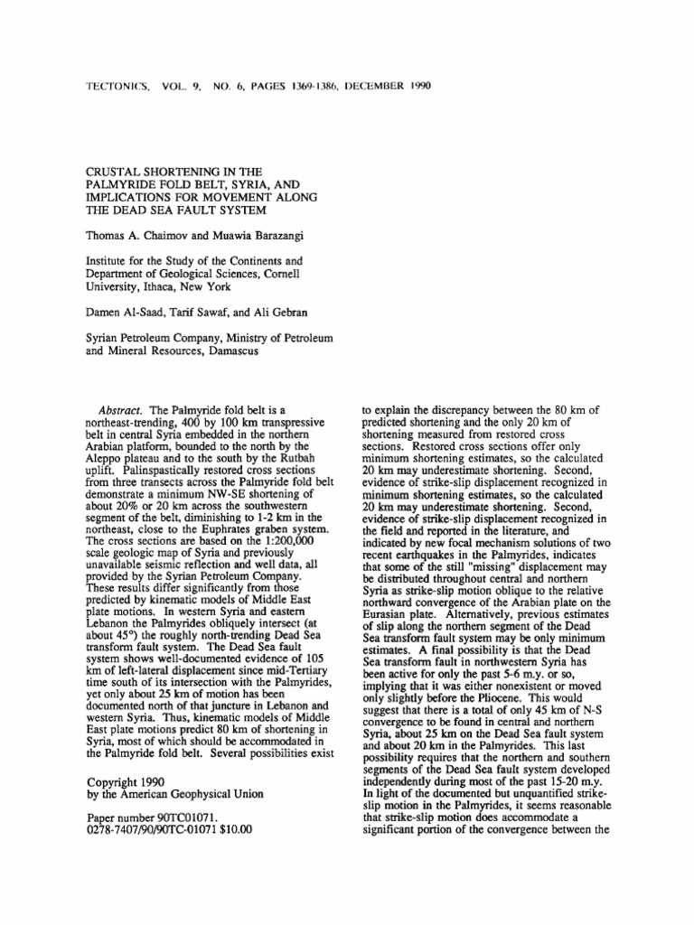 1370                                    Chaimov et al.' Palmyride shorteningand Dead Sea Fault Movement