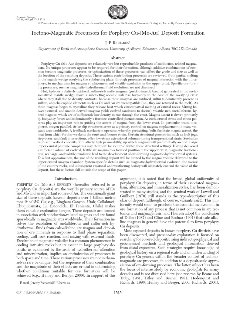 Richards, J.P., McCulloch, M.T., Chappell, B.W., and Kerrich, R., 1991, 1973, The tops and bottoms of porphyry copper deposits: ECONOMIC