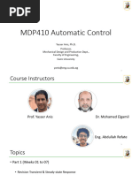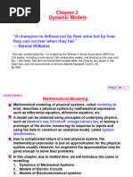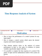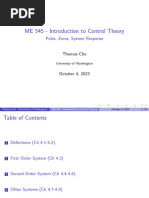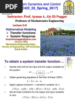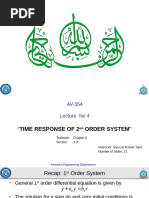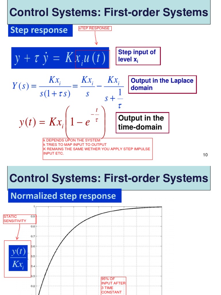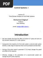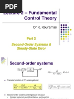 The document discusses first-order and second-order control systems. It describes: 1) How a second-order system can be represented by a differential equation involving mass (m), damping (c), stiffness (k), and input (x(t)). 2) How to normalize this differential equation by dividing all terms by the mass (m) and defining the undamped natural frequency (ωn) and damping factor (ζ). 3) The normalized second-order differential equation in terms of the output (y) response, damping factor (ζ), undamped natural frequency (ωn) and input (x(t)).