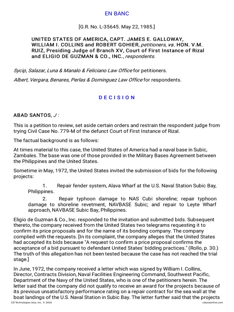 In the case at bar, the efficacy of the contract between the U.S. Naval authorities at Subic