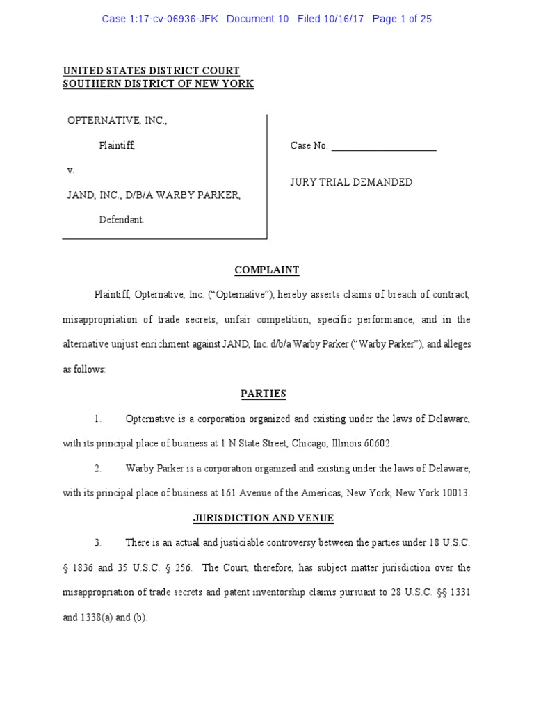 Legal Complaint by Opternative Alleging Online Eye Test Trade Secret Theft by Warby Parker