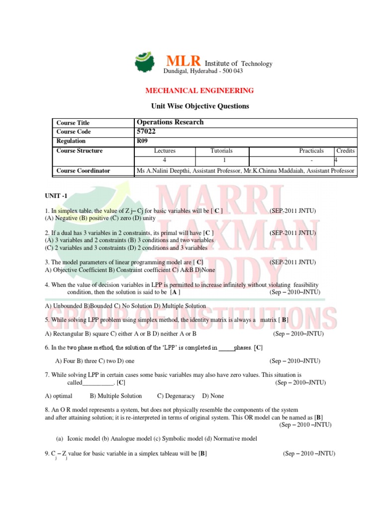 1. In simplex table, the value of Z j Cj for basic variables will be [ C ] (SEP-2011 JNTU)