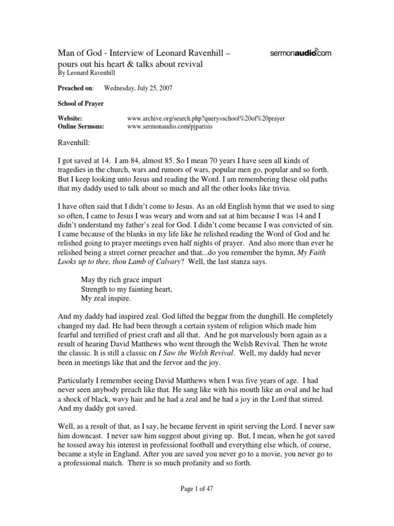 prayed. He was a Pentecostal which was despised. In fact his wife said to hear him pray,