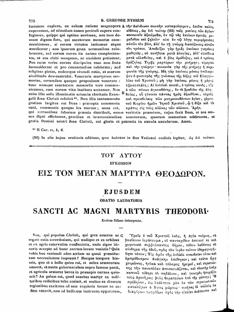 Gregory of Nyssa, In Praise of the Blessed Theodore (Greek text, Migne 46)