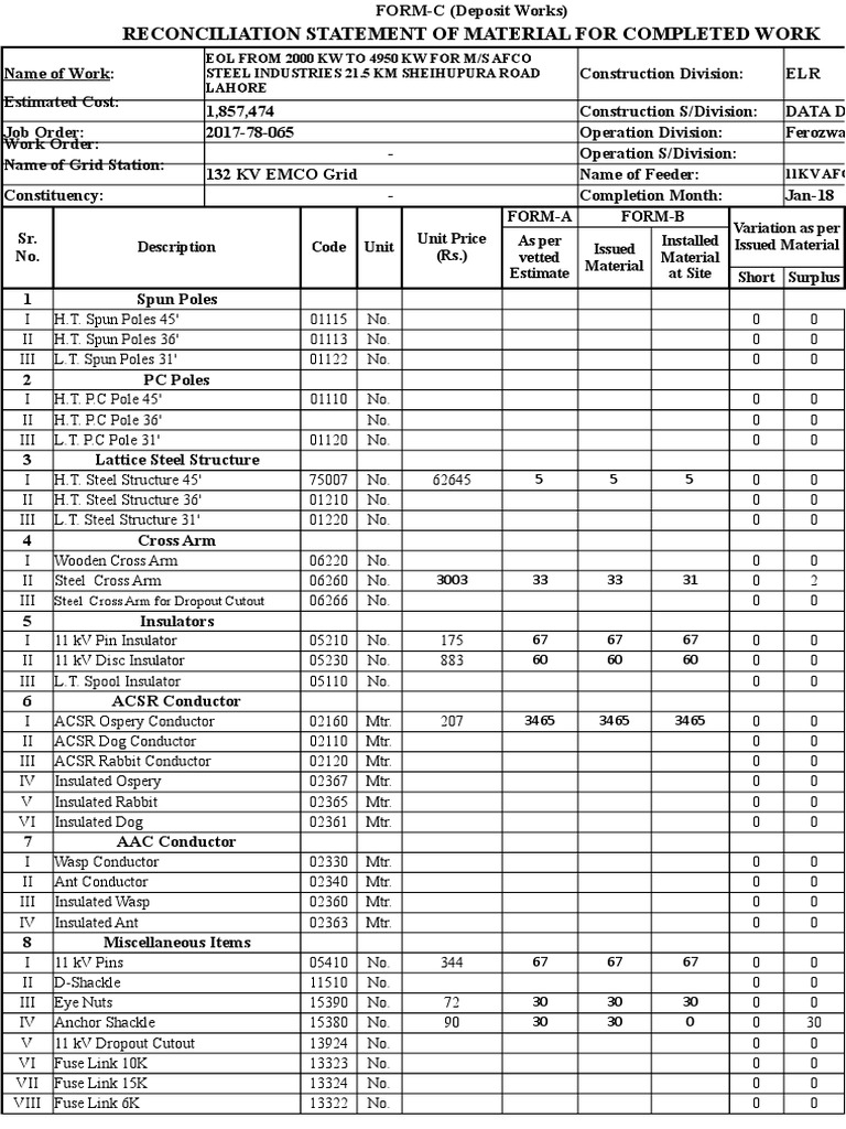 Amount of Installed Overhead Charges Installation Charges Contract Transformr Reused Dismentled Mat