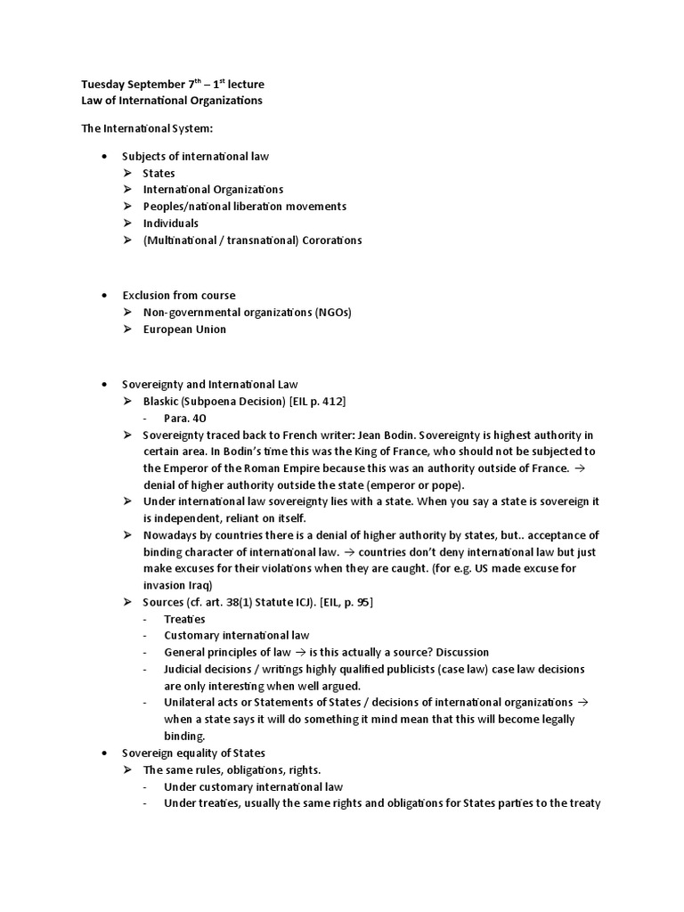 The document discusses the international system and international organizations. It covers several key points: 1) It outlines the subjects of international law, including states, international organizations, peoples, individuals, and corporations. 2) It discusses the concept of sovereignty and how it relates to international law. Sovereignty originally referred to the highest authority within a territory or state. 3) It examines the characteristics of international organizations. International organizations are established by treaty, have states as members, and have a distinct legal will, though they rely on their member states. 4) There is continuous tension between state sovereignty and the need for international cooperation to address global issues. International organizations aim to facilitate cooperation while respecting