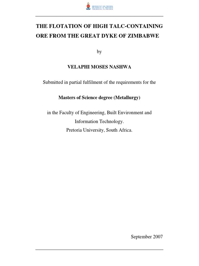 thesis was to investigate the possibility of removing talc prior to the flotation process