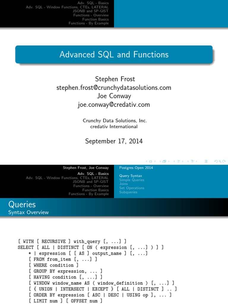 This document summarizes an introduction to advanced SQL concepts presented by Stephen Frost and Joe Conway. It covers window functions, common table expressions, lateral joins, JSONB, set-generating functions, and more. Examples are provided for basic query syntax including SELECT statements, joins, set operations, and subqueries. An overview of join types such as inner, outer, left, right, and full joins is also presented.