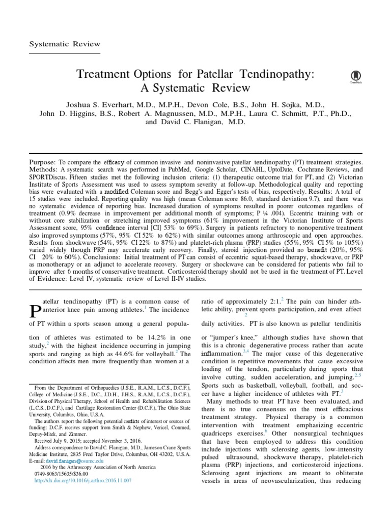 CI 20% to 60%). Conclusions: Initial treatment of PT can consist of eccentric squat-based therapy, shockwave, or PRP