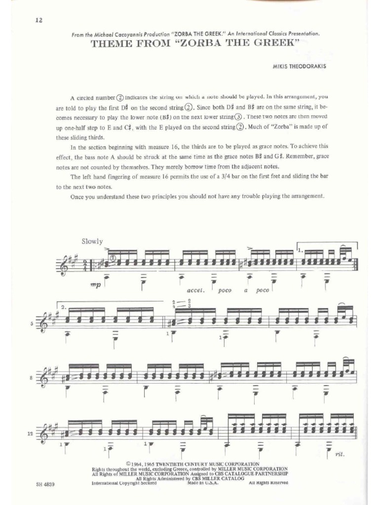 ‘up one-half step to E and C#, with the E played on the second string (2). Much of "Zorba" is made up of
