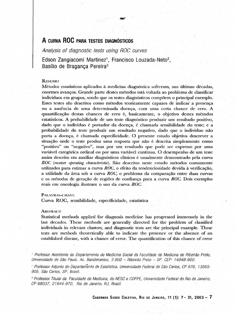 0 ratings0% found this document useful (0 votes) 67 views25 pagesA Curva ROC para Testes Diagnosticos Cadernos Saude Coletiva Vol11 JanJun