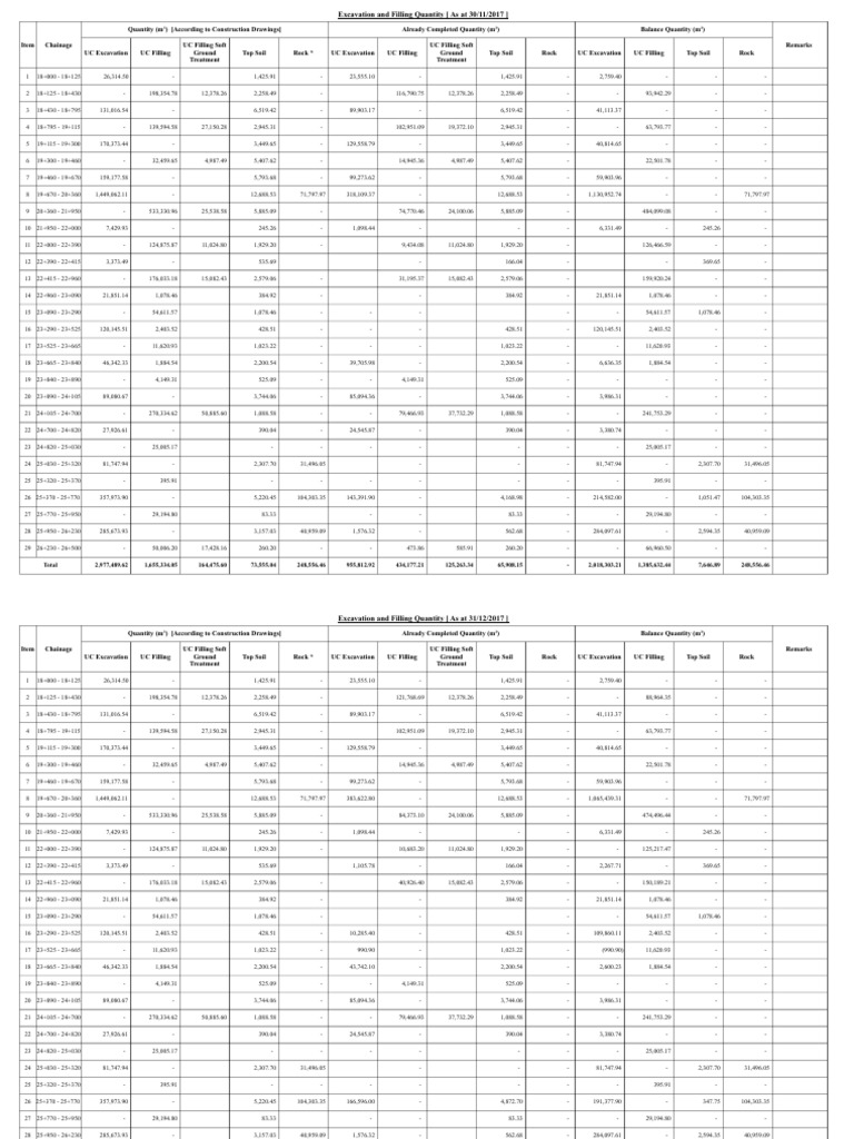 Excavation and Filling Quantity [ As at 31/12/2017 ]