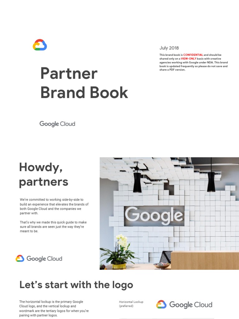 This brand book provides guidelines for using Google Cloud logos and branding when partnering with other companies. It explains that the horizontal lockup is the primary logo and includes options for vertical lockups, wordmarks, and file formats. It provides directions on logo spacing, placement, sizing, and examples of proper and improper usage across various materials. The document is intended only for creative agencies working with Google Cloud under NDA.