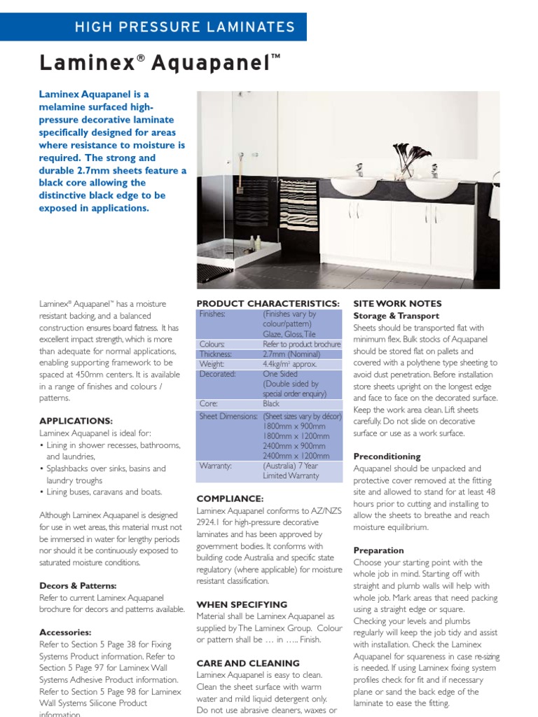 • Splashbacks over sinks, basins and Warranty: (Australia) 7 Year Aquapanel should be unpacked and