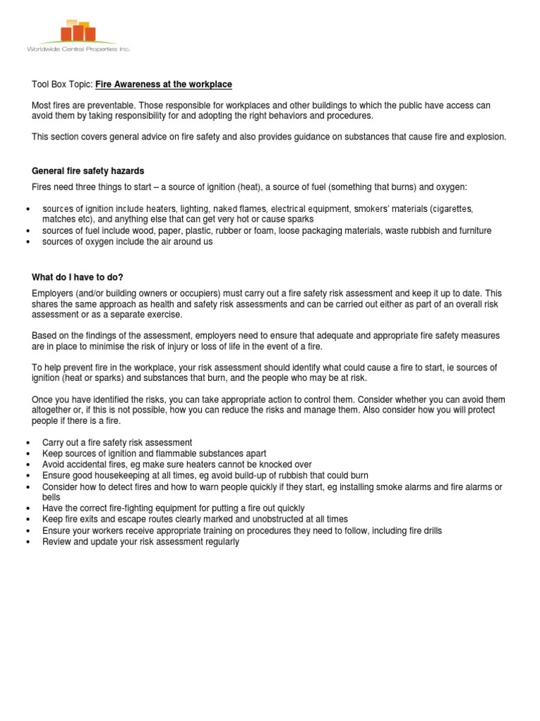 To help prevent fire in the workplace, your risk assessment should identify what could cause a fire to start, ie sources of