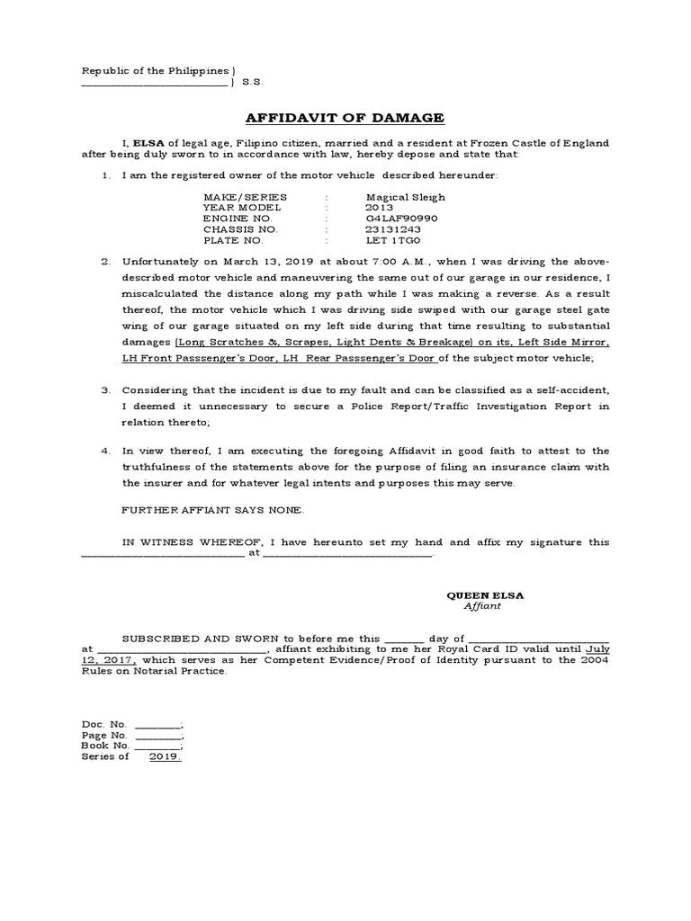I, ELSA of legal age, Filipino citizen, married and a resident at Frozen Castle of England