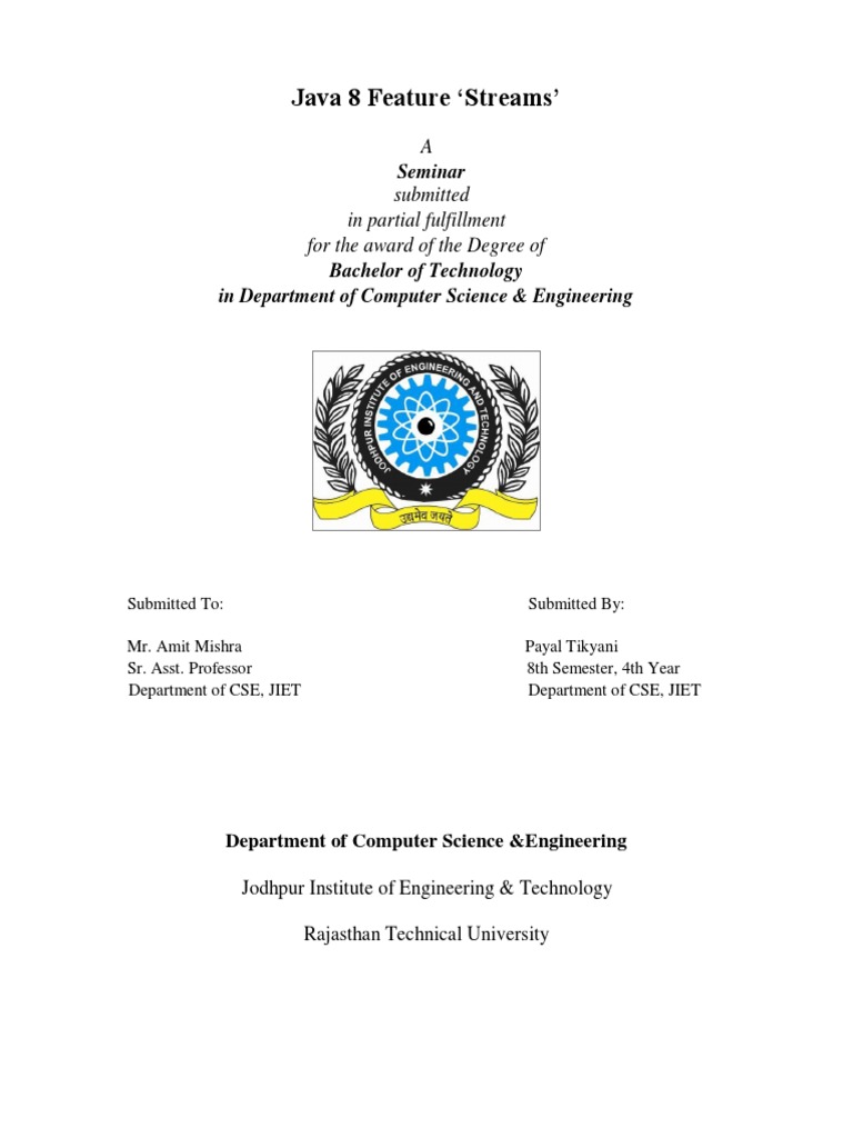 This document appears to be a seminar report on Java 8 streams. It includes an introduction to streams, describing them as wrappers around data that allow for aggregate operations like filtering, mapping, and reducing. It outlines chapters on creating streams, operations on streams, and parallel streams. The document contains acknowledgments, an abstract, table of contents, and introduction section providing more details on streams and how they differ from collections.