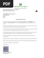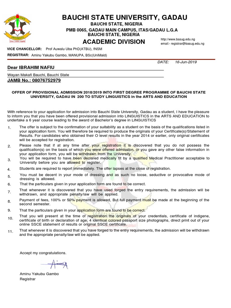 With reference to your application for admission into Bauchi State University, Gadau as a student, I have the pleasure