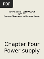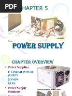 The document discusses computer power supplies, including how electricity works, types of power supplies, power connectors, installing and maintaining power supplies, and troubleshooting power issues.