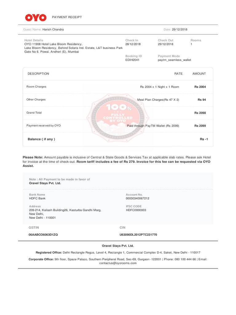 for invoice at the time of check-out. Room tariff includes a fee of Rs 279. Invoice for this fee can be requested via OYO