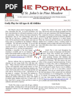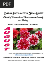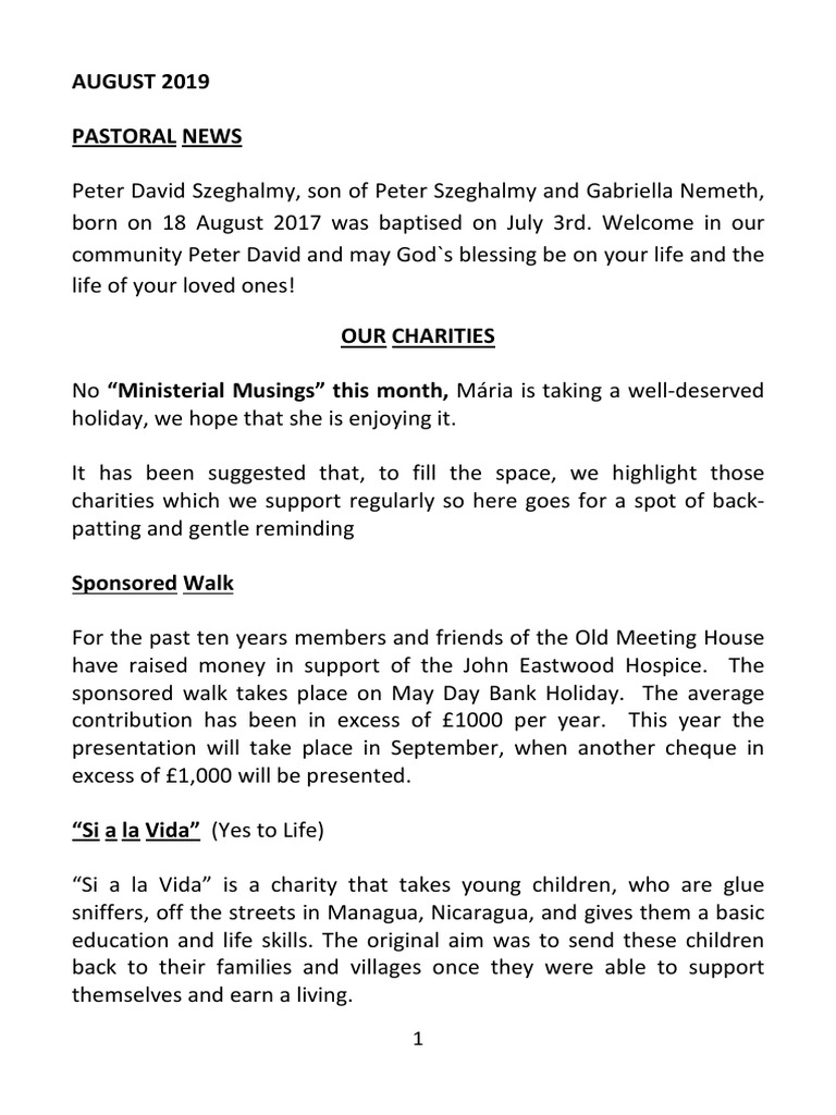 The document provides summaries of various charities supported by the Old Meeting House congregation over the past year, including the John Eastwood Hospice, Si a la Vida in Nicaragua, Children in Need, and Send-a-Child-to-Hucklow. It is noted that over £1000 was raised for the hospice and £306 for Send-a-Child-to-Hucklow through the congregation's Jars of Grace collection. The document also announces upcoming services and events at the church in August, including a visit from Underbank Chapel visitors on August 18th.