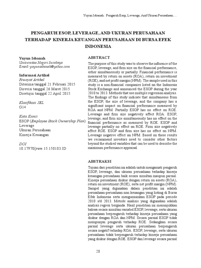 Yuyun Isbanah : Pengaruh Esop, Leverage, And Ukuran Perusahaan.....