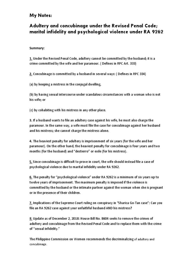 This document discusses adultery, concubinage, and psychological violence under Philippine law. It notes that adultery can only be committed by the wife, while concubinage must be proven by showing the husband committed one of three acts: keeping a mistress in the home, having sex in scandalous circumstances, or cohabiting with the mistress. Concubinage is difficult to prove so filing a case of psychological violence under RA 9262 is recommended instead, with penalties of 6-12 years imprisonment. The document also discusses debates around decriminalizing adultery and concerns about discrimination against women in the Revised Penal Code.