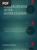 This document covers the various fieds the students can choose after matric in Pakistan. The students can study further and take different subjects or they can do differrent diploma courses aor they just do a job. All the options after matric has been clearly explained in this document.