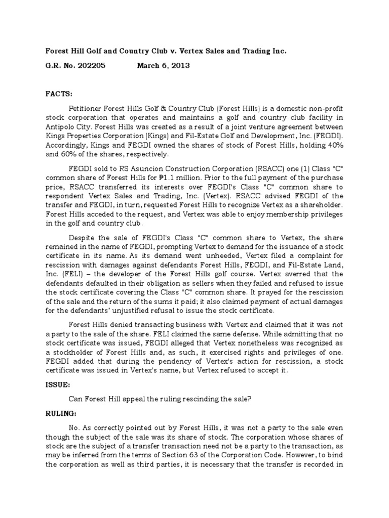 transfer and FEGDI, in turn, requested Forest Hills to recognize Vertex as a shareholder.