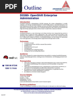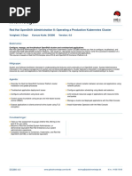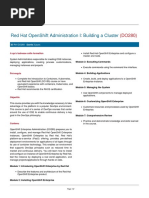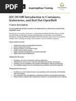 This document provides an overview of a course that teaches students how to containerize software applications using Docker and Kubernetes and deploy them on Red Hat OpenShift. The course covers container architecture, creating and managing container images and services, deploying single and multi-container applications on OpenShift, and troubleshooting containerized applications. Upon completing the course, students will be able to containerize applications, deploy them on OpenShift, and demonstrate skills like creating containerized services and custom images.