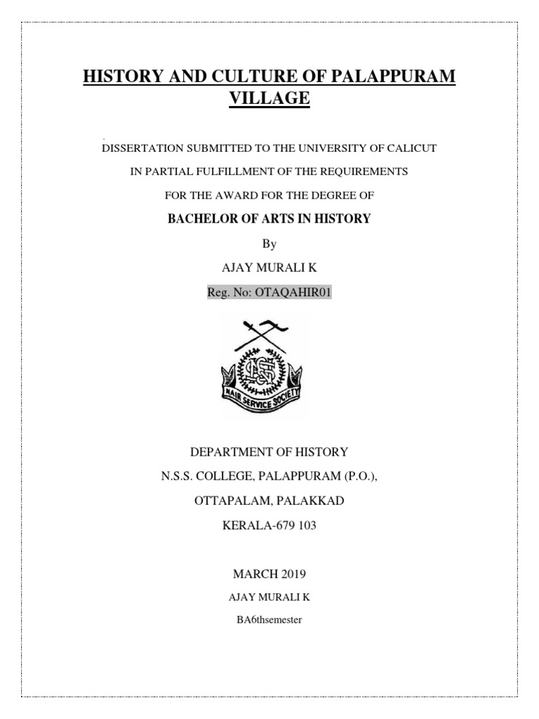 of the Department of History, N.S.S. College, palappuram and it has not been submitted before