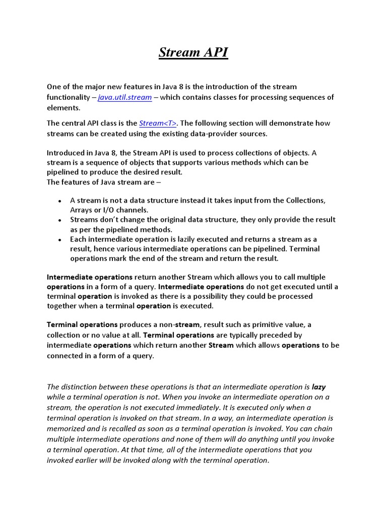 Introduced in Java 8, the Stream API is used to process collections of objects. A